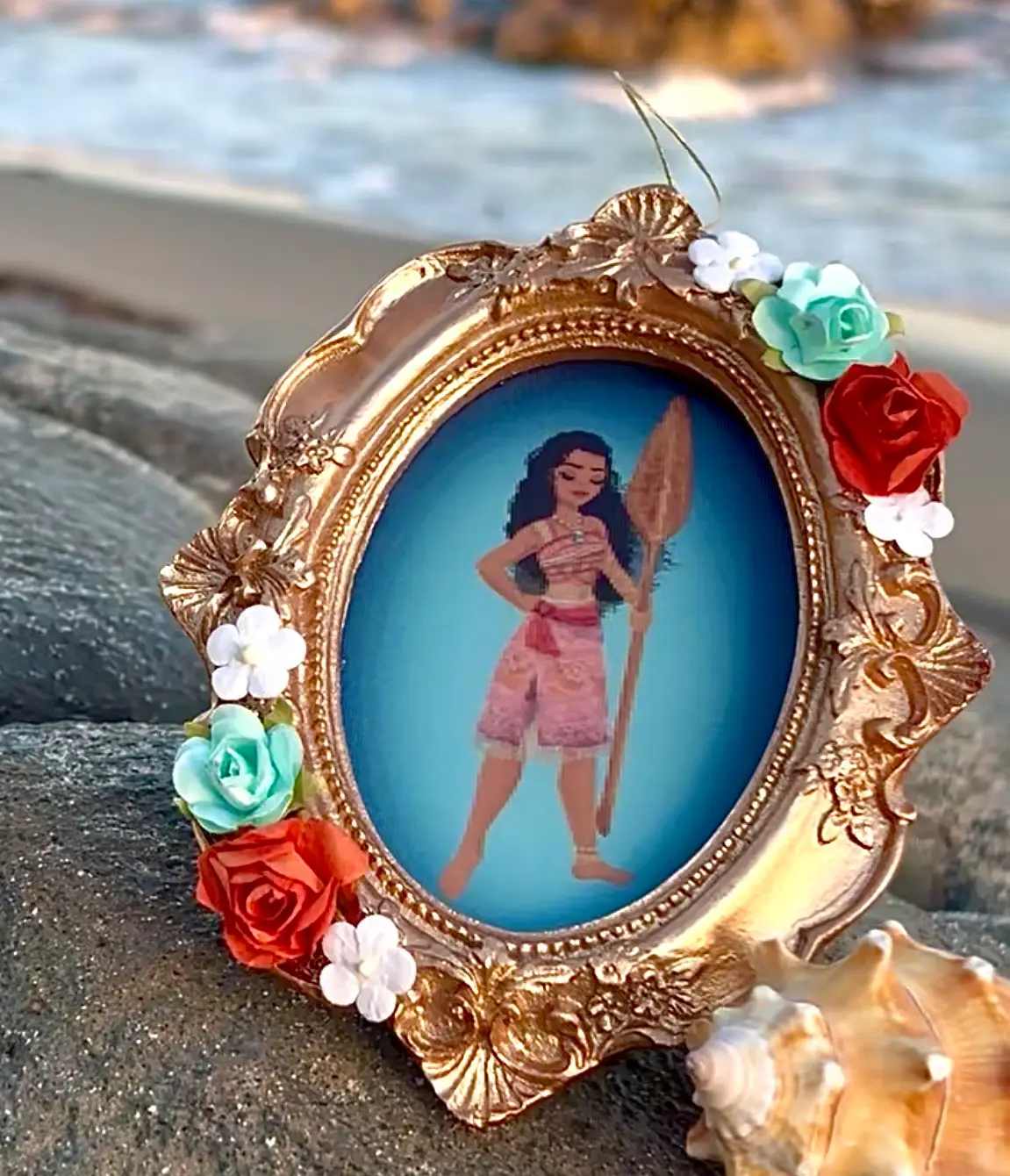 This brand new princess transformation ornament features this fearless leader as she shifts into her new powers. The images change from side to side (as you walk past). Framed in a gold-colored resin oval frame, this royal ornament is adorned with paper flower accents and a gold hanging cord.